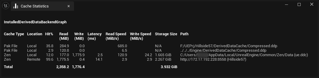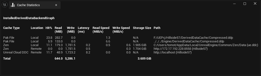 HillsideサンプルでローカルZenServer・リモートZenServer・UnrealCloudDDCを有効にした時のキャッシュ状況はこんな感じになりました。