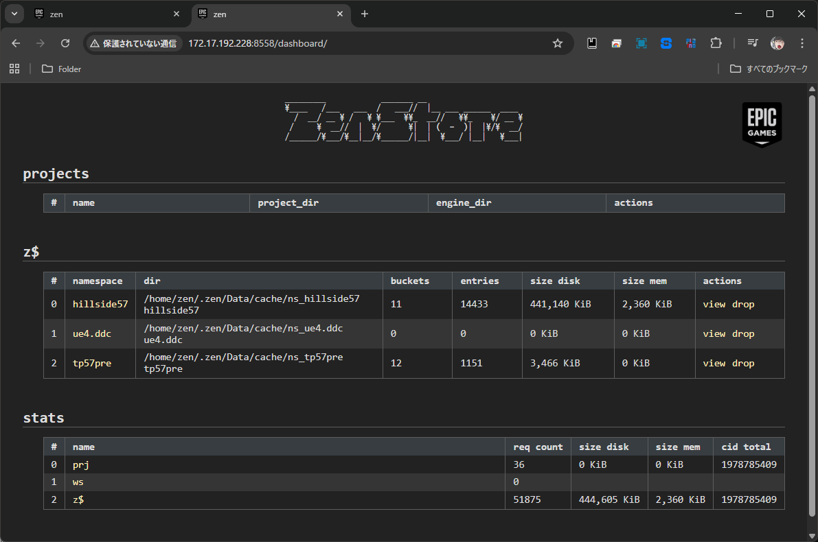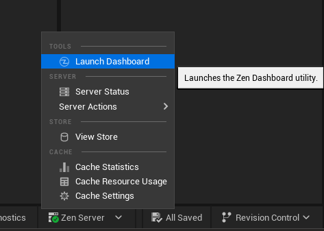 UEエディタの右下にあるZenServerのアイコンをクリックして、Launch Dashboard を表示すると、ローカルのZenServerの状態が表示されます。